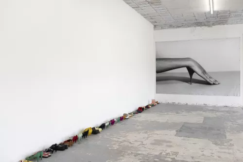 Cinzia Ruggeri stilista gioca molto con la moda, per lei l’abito era “lo spettacolo (sempre intenzionale) di noi stessi”. Entrambe, Ruggeri e Jürgenssen, hanno fatto del gioco una dimensione fondamentale delle loro opere, gioco che si manifesta nella leggerezza del travestimento e nella sovversione delle norme sociali. La dimensione ludica si dipana lungo il percorso espositivo organizzato in stanze in cui sono esposte le opere: il travestimento è parte del gioco che la moda e i suoi oggetti possono offrire, che siano gli stivali Italia di Cinzia (1986) o i sandali-letto (Bed Shoes 1976) di Birgit. Com’è noto a chi conosce la sua attività, Cinzia ha tuttavia trascurato l’aspetto commerciale della faccenda moda, senza essere del tutto avulsa da una ricerca di concretezza. I suoi abiti si potevano indossare, anzi, era ed è un piacere farlo. In mostra ce n’è uno di organza verde – che richiama il celebre ziqqurat-omaggio a Lévi Strauss, indossato nel 1984 da Antonella Ruggiero/ Matia Bazar. Cinzia faceva parte di quel gruppo di donne milanesi, possiamo citare in primo luogo Nanni Strada, che offrivano, ognuna a modo proprio, la loro ricerca di designer, artiste e progettiste alla nascente cultura del made in Italy. Conosciuta soprattutto per la sua vicinanza all'architettura postmoderna e ai gruppi Alchimia e Memphis, Cinzia Ruggeri ha trasformato la vita di tutti i giorni con forme eclettiche, come nello specchio a braccia (Schatzi 1995) e nel divano (Colombra 1990) esposti in mostra. Lavorando all'incrocio tra design industriale, moda, scultura e installazione, la sua pratica ha attraversato il maggior numero possibile di generi.