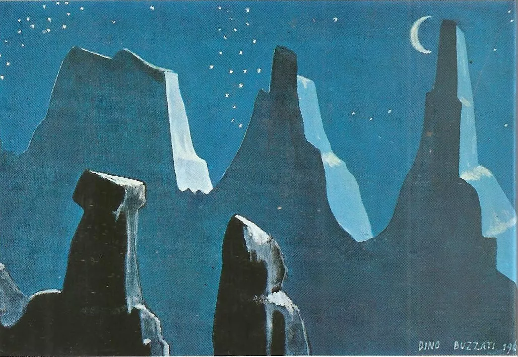 In copertina, Le Crode dei Marden sotto la luna, di Dino Buzzati (1972).