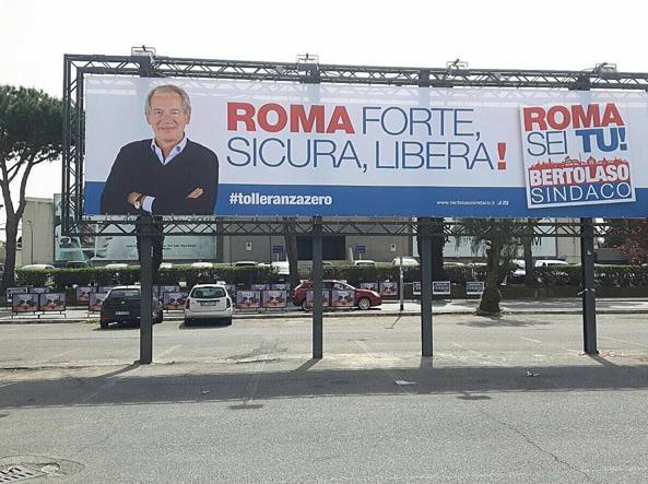 Ecco allora che il primo a sbucare nell’ombra che avanza dal terrapieno della ferrovia è Guido Bertolaso. Nel manifesto indossa un pullover scuro con lo scollo a V, una camicia azzurrina che si lascia intravedere dal colletto e dal polsino, un orologio col cinturino in pelle. Bertolaso tiene le braccia incrociate al petto, ha la testa leggermente insaccata nelle spalle, il viso sorridente con un occhio più chiuso dell’altro. Il suo slogan è: «Roma forte, sicura, libera!». Solo che il sorriso pacioso e ottimista di Guido Bertolaso sembra cercare il consenso di se stesso prima ancora che l’attenzione del passante romano.