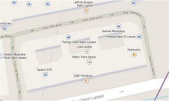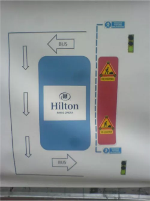 Accidents happen. The Hilton Paris Opera Hotel at Gare St. Lazare in Paris, as seen from above, or on a map, has (almost) the shape of a rectangle with rounded angles. Roadwork around the Hilton disrupts the circulation. Signs are posted to help pedestrians find their way. On those signs, the Hilton rectangle is represented by an icon that further simplifies its shape – and is actually the globalized smartphone icon. We witness an interesting and so far poorly documented phenomenon, accidental icon capture. With consequences: The three internal courtyards of the Hilton are reduced to one, and turned into the smartphone's screen.