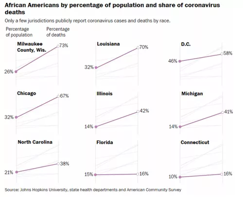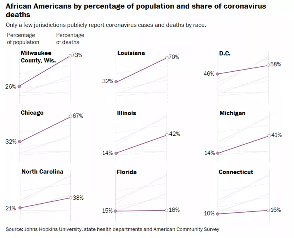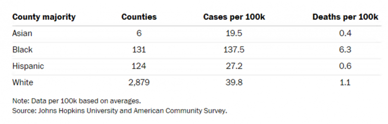 Negli Stati Uniti un resoconto del “Washington Post” già nel primo mese della pandemia rivelava che la stragrande maggioranza delle vittime si concentrava tra la popolazione più povera, e in particolare nei quartieri-ghetto a maggioranza nera. A Chicago, per esempio, “la metà dei contagiati e il 72% delle vittime del Covid-19 erano afroamericani, nonostante questa comunità rappresenti il 30% della popolazione totale”. Uguali rapporti per Detroit e la stessa New York dove la strage è stata immensa. In generale, comunque, affermava il giornale non certo sospettabile di simpatie leftist, nelle 131 contee a maggioranza nera si è registrato il triplo dei contagi rispetto a quelle a maggioranza bianca e un numero di morti sei volte superiore (The coronavirus is infecting and killing black Americans at an alarmingly high rate – 7 aprile). Studi successivi, relativi al mese di maggio, hanno confermato questa sproporzionata distribuzione dei contagi e delle morti da coronavirus nelle contee con significativa presenza di popolazione afroamericana nella quale si concentra più della metà del numero totale dei contagi e il 60% dei morti.