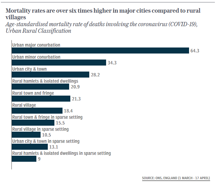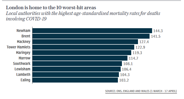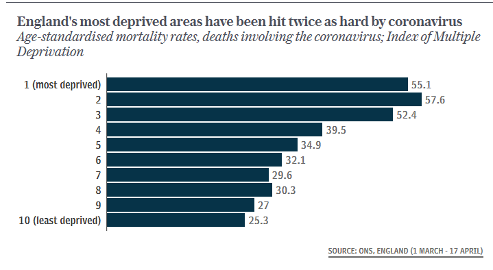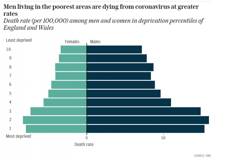 Se poi potessimo scendere più nel dettaglio, e tracciare il contagio all’interno dei luoghi in cui ha colpito, in quali strati sociali, in quali quartieri si è concentrato e ha fatto più vittime, avremmo una mappatura sociale preziosissima non solo per le considerazioni socio-politiche cui si presta, ma anche per la possibilità di mettere in campo strategie di contenimento dell’epidemia meno approssimative. Là dove questo è stato fatto (poche realtà per la verità) ci è stata restituita un’immagine della pandemia impressionante per la chiarezza del messaggio che veicola. Nel Regno Unito, per esempio, dove l’ Office for National Statistics ha “mapped” i tassi di mortalità da Covid-19 in England e nel Galles, si vede benissimo che il virus – al contrario della fortuna, che come è noto è cieca, e come la sventura che invece “ci vede benissimo” – ha colpito con un’infallibile selettività sociale, infierendo in basso e risparmiando benevolmente gli strati alti, come sintetizza il titolo del “Telegraph” che ne dà notizia: Mapped. How coronavirus death toll has hit the poorest areas hardest. Il rapporto conferma che sono state le città, grandi e medie, l’epicentro dell’epidemia (il tasso di mortalità è qui sei volte maggiore che nelle aree rurali); ma soprattutto che in quei conglomerati urbani sono stati i più poveri (gli abitanti dei quartieri “most deprived”) i più duramente colpiti con un tasso di mortalità più del doppio rispetto a quelli “rich”, con un Age-standardised mortality rate (cioè un tasso medio di mortalità ogni 100.000 abitanti misurato facendo omogenea la composizione per età) di 55,1 al primo livello (i most deprived) e di 25,5 al decimo livello (i least deprived). Per Londra, di gran lunga l’area col maggior numero di contagi, il tasso di mortalità nei quartieri poveri della periferia (Newham, Brent) schizza addirittura a 144,3 mentre in zone come quella di Ealing o Lambeth si mantiene intorno a 100…