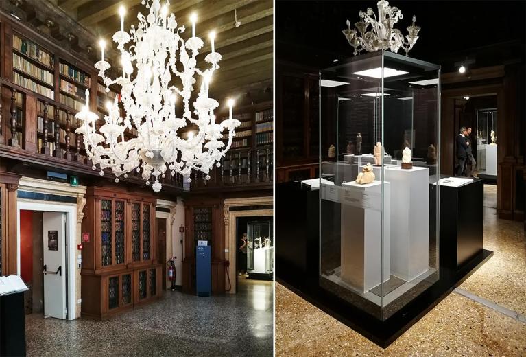 Chissà cosa mai avranno significato queste incisioni geometriche, mi chiedo aggirandomi nelle sale deIl’Istituto Veneto di Scienze Lettere e Arti. Le stanze sono invase dal pungente ma piacevole e aromatico odore dei vecchi libri stipati negli armadi addossati alle pareti. Attraverso l’olfatto percepisco il peso delle parole sulle immagini esposte. Quali saranno state le narrazioni che accompagnavano queste statuette?