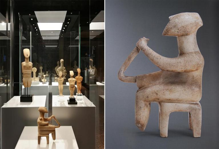 Senza le parole le immagini sono mute e forse per questa ragione ne ammiriamo le forme senza porci il problema del racconto al quale si riferivano. Ammiriamo i volumi geometrici della Figura seduta con copricapo del V millennio a.C. e quelli della Testa di figura femminile distesa dell’Antico Cicladico II perché ci ricordano le sculture di Constantin Brancusi e di Amedeo Modigliani.