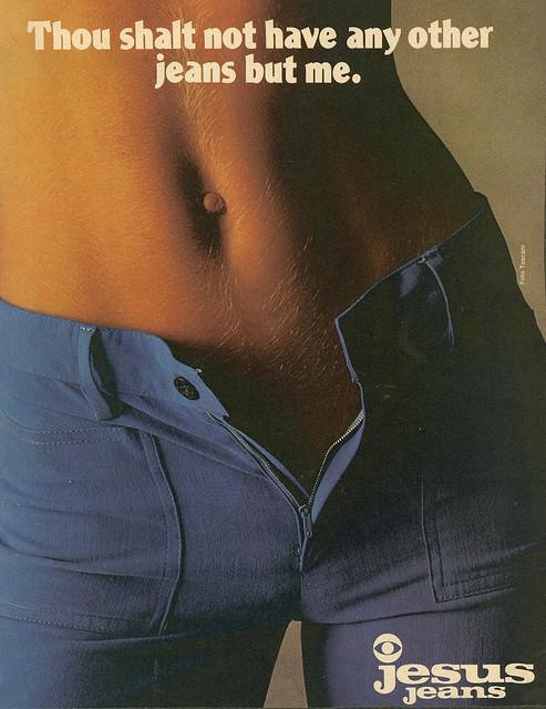Coloro che hanno prodotto questi jeans e li hanno lanciati nel mercato, usando per lo slogan di prammatica uno dei dieci Comandamenti, dimostrano - probabilmente con una certa mancanza di senso di colpa, cioè con l’incoscienza di chi non si pone più certi problemi - di essere già oltre la soglia entro cui si dispone la nostra forma di vita e il nostro orizzonte mentale.