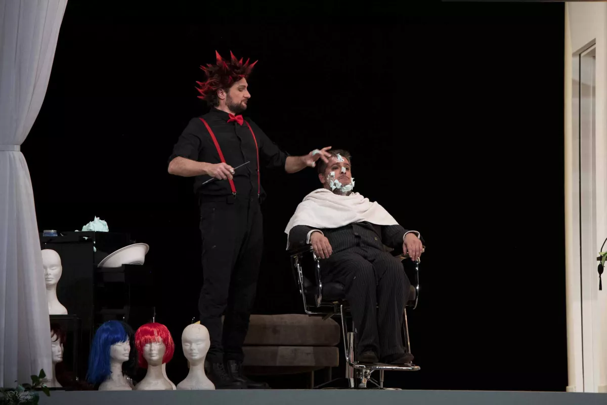 Intorno e a contatto con questa varia e attualissima umanità, la partita amorosa e generazionale fra il Conte di Almaviva e don Bartolo per impalmare la vivace Rosina, un po’ maliziosa e un po’ infantile, viene giocata con una linearità narrativa che è tra i punti di forza dello spettacolo e con una sottigliezza attoriale con pochi paragoni rispetto a quel che passa sui palcoscenici operistici. Tutti i cantanti sono infatti anche attori divertiti e divertenti, non solo nel dipanarsi della loro storia, ma nel rapporto con la varia umanità silente e variamente indaffarata che li circonda. De Angelis, poi, non rinuncia alle controscene che la scenografia rende quasi naturali, anche se rischiose. Così, quando Rosina si presenta nella sua celebre Cavatina “Una voce poco fa”, a pochi metri da lei, nella bottega del barbiere, Figaro e Berta si fumano una sigaretta o forse si fanno una bella canna: una scena grottesca che probabilmente attira maggiormente l’attenzione del pubblico, così come l’attira maggiormente il silenzioso e caricaturale duetto erotico che sempre Berta ingaggia con Fiorello al piano terra mentre sopra le loro teste si decide la sorte di Rosina nel terzetto con Figaro e Almaviva che conduce al Finale ultimo.