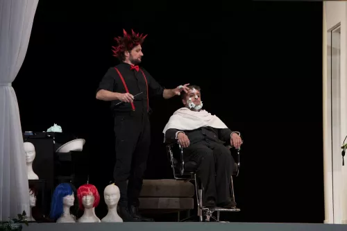Davanti a questo piccolo mondo in conflitto generazionale (Rosina, Figaro e Almaviva “contro” Bartolo e Basilio, con Berta a fare da trait-d’union: anziana per età ma giovane di spirito), sfilano muti a proscenio i giovani della Gen Z che in locandina sono definiti “abitanti della città”. Sono idealmente personaggi alla Tati: nei loro gesti la normalità diventa paradosso e la loro relazione con i protagonisti della commedia tocca spesso il nonsense. Si tratta di un manipolo di bravissimi attori (Giada Cerroni, Sofia Clemente, Maddalena Dal Maso, Francesco Dall’Occo, Andrea Gennaro ed Enrico Zelante) che di volta in volta fanno i rockettari, indossano i panni dello spazzino e della suora, dell’addetto al delivery (Rosina mangia la pizza che le è stata consegnata mentre duetta con Figaro) e del runner sempre più dipendente dalla sua corsa quotidiana (fino a comparire alla fine con una lunga barba), di un impiegatino e di un senzatetto che si prepara il giaciglio con il cartone. L’attualità di troppe cronache fa irruzione durante la pagina solo strumentale che introduce al finale ultimo dell’opera, il cosiddetto “Temporale”, quando due figuri si accaniscono contro di lui, prendendolo a calci e riducendolo a malpartito.