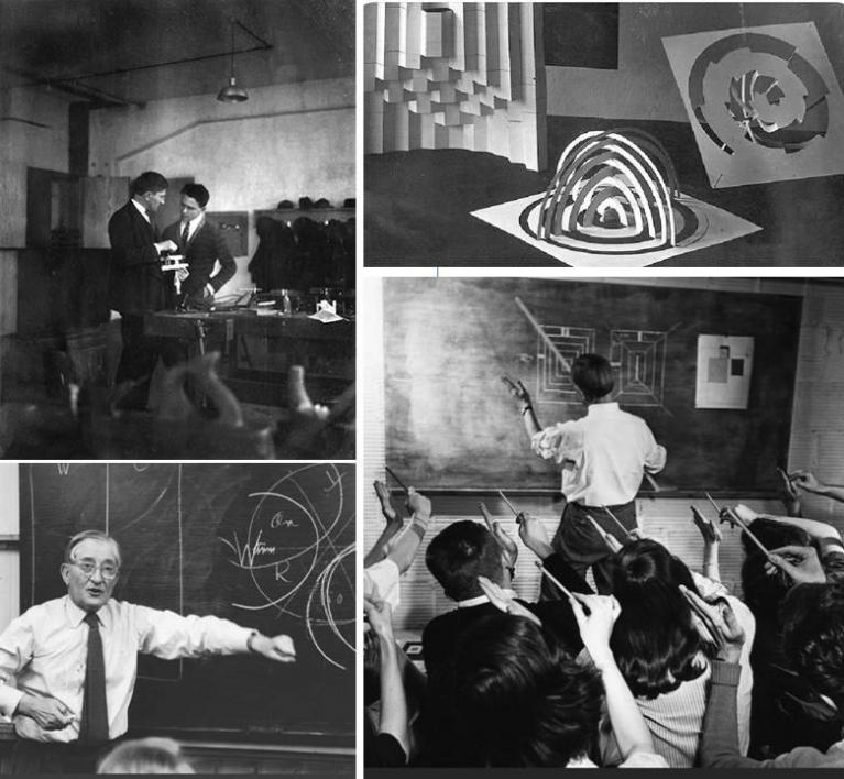 In alto: Josef Albers al Workurs del Bauhaus di Weimer con un allievo; alcuni lavori dei suoi studenti risalenti al 1928, sul tema della traslazione della forma dal piano allo spazio. Sotto: due momenti delle lezioni di Albers al Dipartimento di Design della Yale University, da lui diretto negli anni cinquanta, dopo la sua fuga dalla Germania nazista.