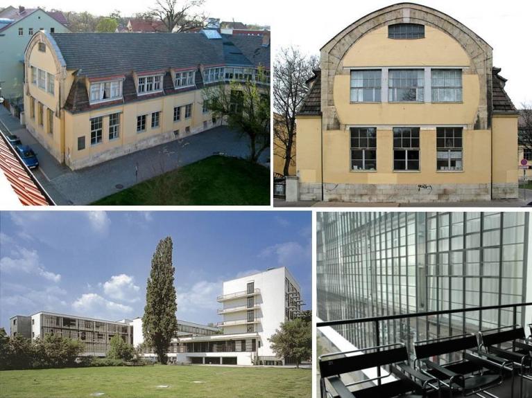 In alto: Weimar, l’edificio progettato da Henry van de Velde per la Scuola granducale d’Arte Applicata della Sassonia che dal 1919 ospitò il Bauhaus. Sotto: Dessau, gli edifici del Bauhaus progettati da Walter Gropius, l’insieme dell’esterno e uno scorcio degli interni in cui si vedono le poltrone Wassili di Marcel Breuer.