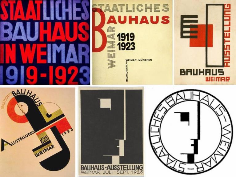 In alto: Herbert Bayer (a quella data ancora studente e poi, dal 1925, giovane maestro) e László Moholy-Nagy, copertina del catalogo della mostra del Bauhaus, Weimar, 1923. È il primo libro pubblicato dal Bauhaus. Tipografia di László Moholy-Nagy; design di Herbert Bayer. Testi di Gropius, Klee, Kandinsky, Moholy-Nagy, Schlemmer e Grunow); contro copertina del medesimo catalogo; Kurt Schmidt, locandina per la mostra del Bauhaus a Weimar, 1923. Sotto: Joost Schmidt, Manifesto per la mostra del Bauhaus, 1923; Herbert Bayer, biglietto d'invito alla Mostra del Bauhaus, Weimar, 1923; Herbert Bayer, logo del Bauhaus di Weimar. La mostra del Bauhaus del 1923, a cui Gropius aveva assegnato il tema “Arte e tecnica, una nuova unità” è stato uno degli eventi culturali più importanti degli anni venti. Fu visitata da quindicimila persone, un record se si pensa alle difficoltà di trasporto per arrivare a Weimar e agli scarsi mezzi di comunicazione pubblicitaria.