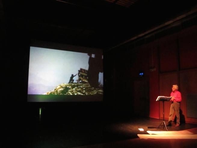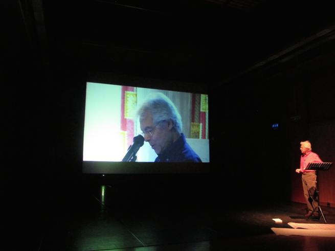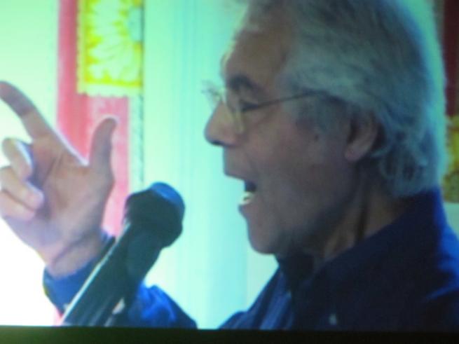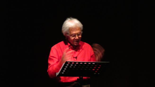Scandisce i suoi versi, il suo racconto, questo poeta narratore attore scrittore, accompagnandoli con movimenti delle mani lungo un’immaginaria linea orizzontale, d’orizzonte, e verso una contromisura verticale, l’asse del cielo e degli inferi. Macina con le parole evocazioni, ricordi, cultura, un pezzo della nostra storia recente; salta nell’immaginazione, nell’immaginario. Rimanda al fremito del corpo, al mormorio della terra, perché “metrica – il metro/misura” “è anche il tremito – e la metamorfosi della vita – il suo vento/respiro”.
