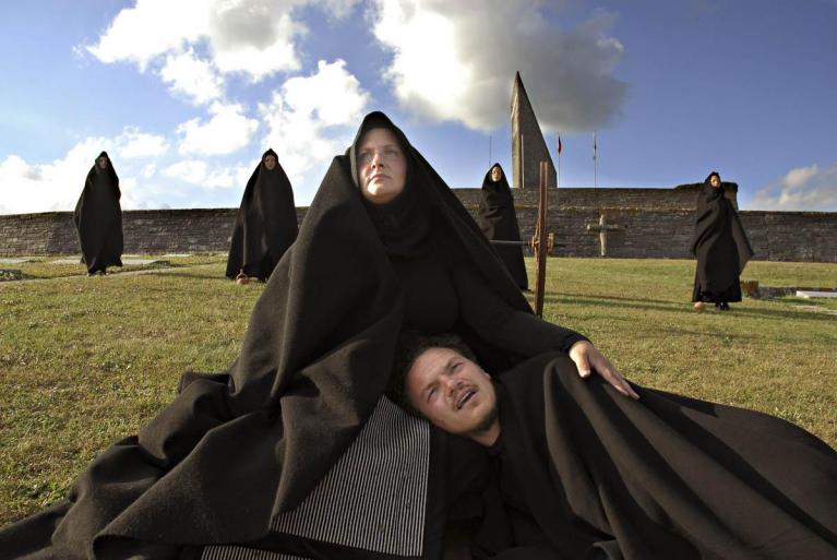 È sorprendente questo spettacolo in mezzo ai boschi, in un luogo che ispira sentimenti contrastanti, la violenza cieca, per l’appunto, e la pace conquistata a prezzo di tante vite. È brechtiano, pasoliniano, ronconiano e perfino ispirato fortemente alle cartesiane, umanissime, aperte visioni ideologiche di quei geni che sono stati Jean-Marie Straub e Danièle Huillet, brechtiani radicali di fine novecento. È freddo, straniato, semplicemente, con grazia, destabilizzante. Ma è pure qualcosa di originale, un atto poetico che riduce il testo antico all’osso per andare a scalfirne le incrostazioni e portarlo a quello che contiene di ancora vivo, di perennemente bruciante. Un “teatro di parola” come lo sognava Pasolini, capace di diventare rito democratico, controversa analisi per via di fantasmi dell’immaginario del nostro stare, singolarmente e in comunità, nel mondo.