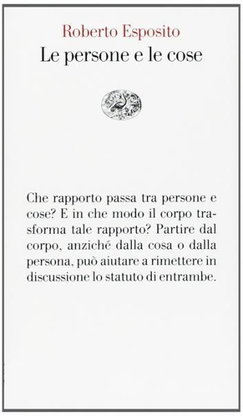 Nota tuttavia, in Le persone e le cose, Roberto Esposito come il tema del corpo, in quanto luogo di transito fra persona e cosa, proprio in epoca contemporanea si ripresenti sotto forme diverse che aprono a nuove e inquietanti problematiche. Fra queste, quella, già antica, del cadavere che trasforma il corpo in cosa, ma soprattutto quella, assai attuale, delle parti del corpo che vengono espiantate e trapiantate, a volte commercializzate. A ciò si aggiunga la polemica incandescente intorno alle questioni dell’uso degli embrioni e del cosiddetto ‘fine vita’, nonché l’ibridazione del corpo con protesi e macchine, sempre più invasive, che lo inscrivono nell’ambito tipicamente cosale della tecnica. Oggi, il corpo è persona o cosa? O, meglio, oggi come, a quanto pare, fin dall’inizio, il corpo è qualcosa che sporge dalla cornice categoriale che divide le persone dalle cose, mettendone in crisi l’assetto?