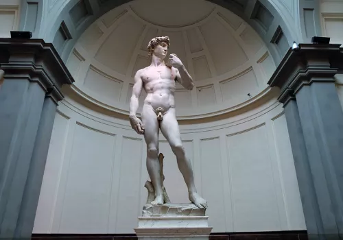 A Firenze, tutte le bancarelle di souvenir acchiappaturisti vendono da tempo immemorabile un gadget irresistibile o repellente, a seconda dei gusti: un grembiule da cucina con l'effigie del David di Michelangelo, un corpo maestoso con il tenero pisellino di chi ha finito di fare l'amore. Dopo aver abbattuto Golia, può finalmente iniziare a pensare ad altro. È un paradosso: la nudità dell'eroe biblico deve proteggere gli abiti del cuoco (o della cuoca) dagli schizzi del sugo incandescente, dall'olio in cui si friggono le patatine, dalla goccia di Nutella con cui si farcisce la crèpe...