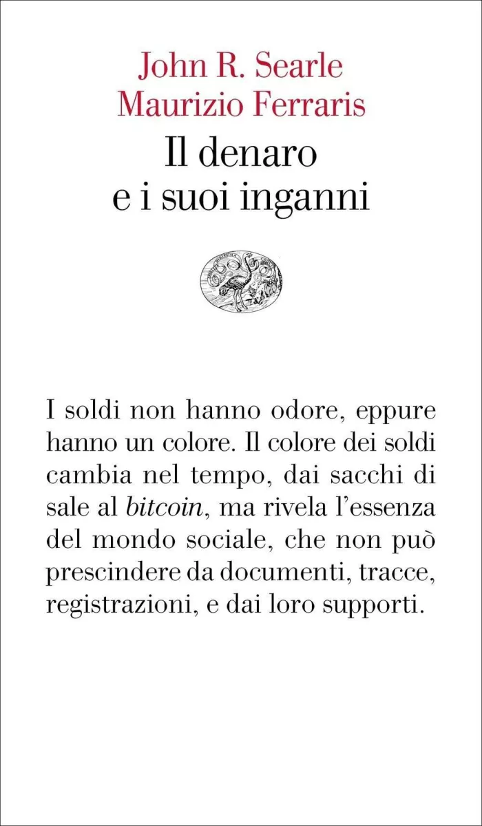 Si può provare a intessere un’altra discussione partendo da Il denaro e i suoi inganni, pubblicato da Einaudi. Nel libro John Searle e Maurizio Ferraris hanno presentato le loro concezioni della moneta (per semplificare userò nel testo denaro e moneta come sinonimi). Non è un tema nuovo per la filosofia, dato che a partire da Aristotele e per arrivare a Simmel, i filosofi si sono interrogati sulla natura del denaro. Nelle righe che seguono cercherò di riassumere le idee dei due autori, sottolineando le affinità e le differenze con la concezione della moneta che hanno gli economisti.