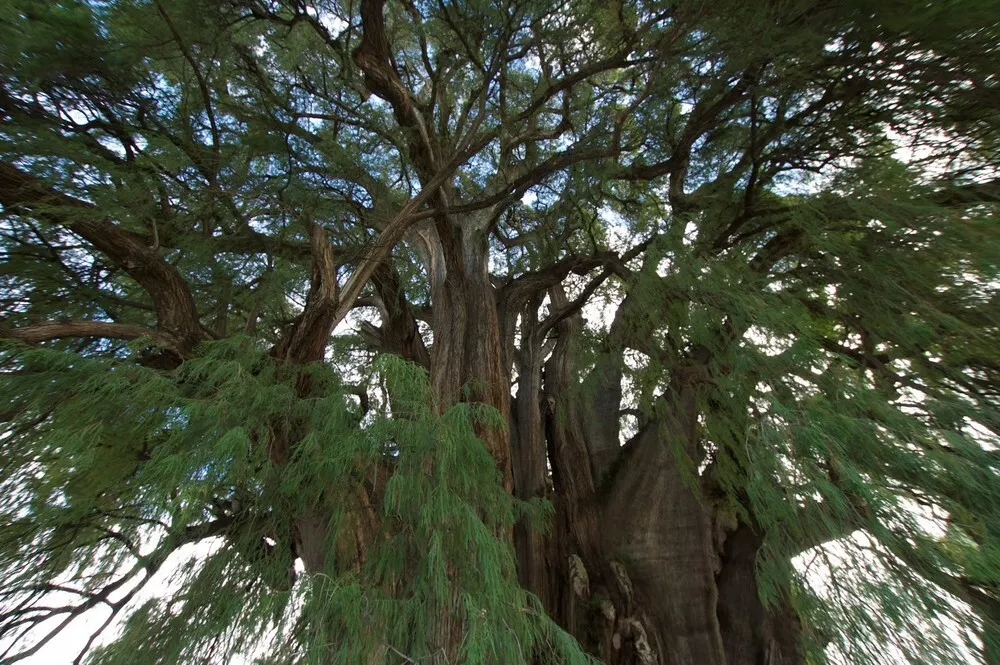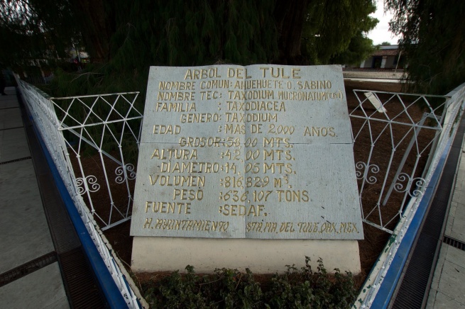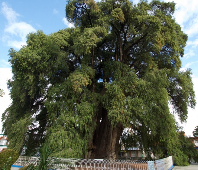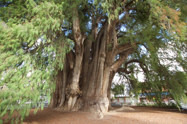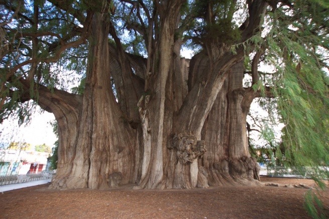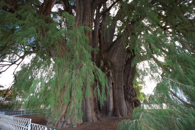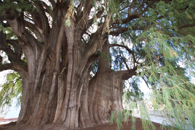 El árbol del Tule non ha bisogno di esorcismi. È lui l’esorcismo vivente: un Taxodium mucronatum, famiglia delle Taxodiaceae (la stessa delle sequoie), alto circa quaranta metri, più o meno quanto misura la circonferenza del tronco, possente e colonnare. La chioma espansa e frondosa ricade a terra in una cascata di aghi piatti e sottili, d’un verde tenero dentro cui si può scomparire. Originario dell’America settentrionale e centrale, il Taxodium è presente anche in Europa (per lo più nella varietà distichum), apprezzato per i suoi pregi ornamentali come le radici aeree – pneumatofori – che gli consentono di vegetare sugli orli di laghi o fiumi, e la scenografica, rugginosa livrea autunnale.