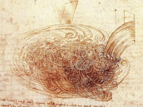 Questo disegno di Leonardo spiega cosa vuol dire aver la seste negli occhi per tracciare linee immaginarie che consentono di individuare i rapporti proporzionali tra le parti, mentre quest’altro disegno anatomico ci mostra quanto sia fondamentale vedere “dentro” , all’interno delle cose se si vuole comprenderne la natura e il funzionamento. Leonardo spiega che per capire come è fatto un muscolo è necessario, fare almeno dieci dissezioni sui cadaveri; la sintesi di queste osservazioni diventa poi un disegno, in cui si deve, progressivamente, eliminare tutto ciò che non è utile a quella specifica rappresentazione: l’occhio di Leonardo, infatti, non ha visto quello che ha disegnato: quello che vedeva il suo occhio era necessariamente molto confuso. Leonardo disegna, quindi, il risultato di una selezione di aspetti visibili funzionale alla comprensione della forma dei muscoli e delle ossa, quale risultato di un’accurata indagine in cui l’occhio ha isolato quello che è essenziale e cancellato tutto ciò che ha giudicato irrilevante per la loro rappresentazione. Allo stesso modo, in questi altri disegni, Leonardo rappresenta un’onda – cosa solo apparentemente facile – o una cascata, quale potremmo vedere in una bacinella o in un lago. Leonardo disegna tanti riccioli e piccoli gorghi, formati dal flusso della corrente; non sono forme effettivamente visibili, sono il frutto di un occhio che registra stenograficamente i fenomeni, “dedotti” visivamente dal rilevamento analitico del fenomeno.