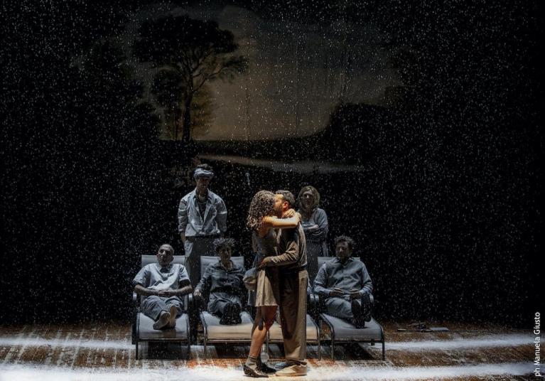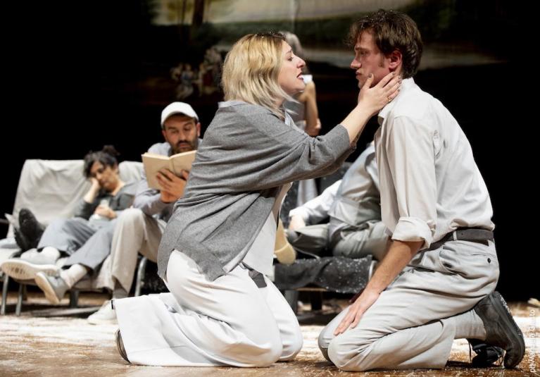Kostja il giovane scrittore che sogna un’arte nuova, una vita differente, ama Nina e scrive per lei un dramma di simbolistici trasalimenti e risonanze. E si scaglia, come Amleto, contro la madre vedova, attrice famosa, amante del vanesio scrittore Trigorin, odiata più che per l’oblio del padre perché lei, Arkadina, tradisce ogni giorno l’arte con l’esibizione di sé. Intorno vegeta un sottobosco di personaggi di una provincia immobile, esausta, che assiste disincantata alla rappresentazione simbolista sul lago, qui con lo sfondo di un dipinto di Lorrain. Maestri di scuola senza speranza, signorine deluse nei loro amori e pronte a una sistemazione di ripiego, possidenti e amministratori, dottori idealisti ma disincantati vivacchiano, spossati, distesi su grigi lettini a sdraio, in vari momenti spostati per disporre differentemente il coro e i protagonisti via via che ne emergono, in una ripetizione asmatica di frasi, malesseri, esibizioni, naufragi. Kostja, con Nina, nel precario teatrino all’aria aperta, sotto la luna, cerca “forme nuove”, incontrando l’incomprensione e la derisone degli altri, ancorati a un teatro (e a una vita) di routine. La madre guarda dall’alto i tentativi del figlio, per poi trovarsi, impotente, a vedere il suo vacuo scrittore flirtare con Nina. È un affondo questo testo, e questo allestimento, negli umori di un’arte che vorrebbe cambiare il mondo, di una gioventù che vorrebbe realizzarsi, rinnovare, e si infrange contro l’indifferenza, la rassegnazione, il dolore cinico degli adulti. Una storia contemporanea.