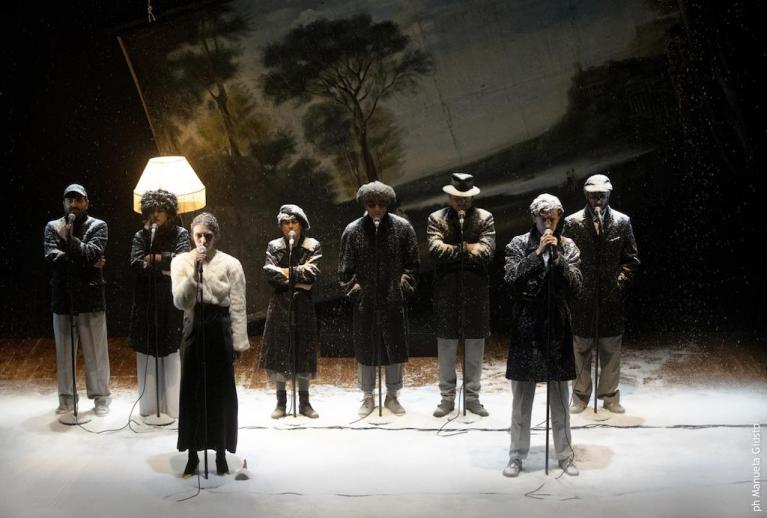 Nella campagna ghiacciata, con una scansione musicale ripetitiva, inizia il viaggio nell’inverno di Schubert, Winterreise. I primi versi ricordano il maggio benevolo, i fiori, l’amore, e ora tutto è finito, gelato, pietrificato, mentre la musica culla con l’incalzare senza scampo di un marciare che sembra un’immobile ninna nanna. Il Gabbiano secondo Licia Lanera, al contrario, fotografa un’estate estenuante, calda come il bacio perduto della canzone di Bruno Martino, estate sfibrante passata su lettini in vite senza movimento, che all’improvviso viene sepolta da una fitta nevicata. Cade la neve, dilaga sulla compagnia di borghesi riuniti in campagna a discutere di tutto e soprattutto di niente, a riempire i vuoti di una vita estenuata, vestiti di scuro “per il lutto che porto per la mia vita”.