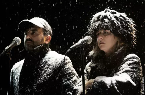 Intorno nevica, nevica. I fiocchi bianchi ricoprono i capelli, gli abiti, i cappottoni pesanti, i colbacchi che inutilmente cercano di riparare dal freddo dei sentimenti, delle esistenze, dilagante. I personaggi sono immobili, tutto pare raggelarsi. Eppure, quel parlare diretto, guardando noi spettatori negli occhi, il loro grido per vite naufragate, la loro disperata implicita richiesta di aiuto, la loro confessione di impotenza ce li porta affianco, vicino, dentro, profondamente. Mentre Tiziano Ferro canta L’ultima notte al mondo: “Cade la neve e io non capisco / che sento davvero, mi arrendo…”.