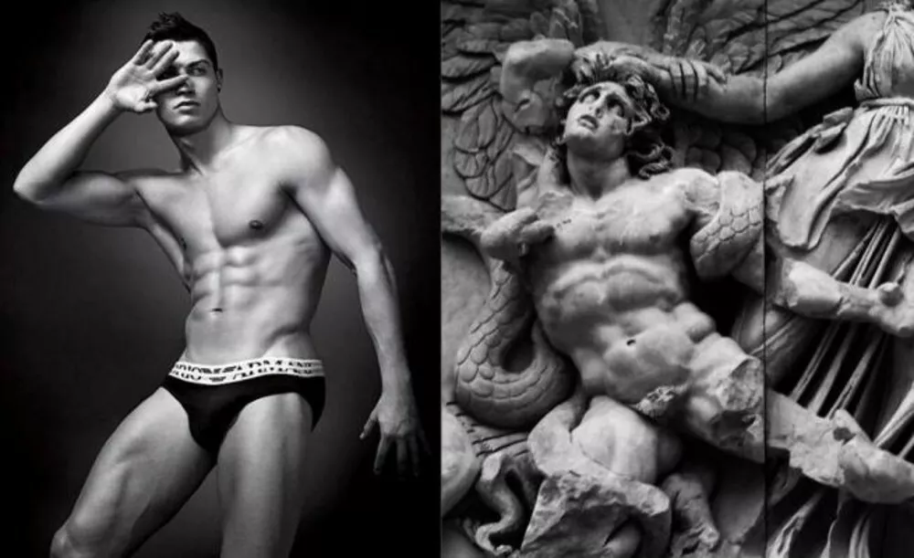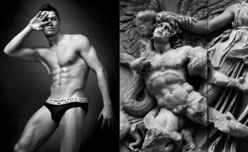 Si dispiega così una visione grafica e fotografica in bianco e nero della scultura antica, una visione falsa, naturalmente, perché le sculture antiche erano colorate anzi coloratissime. Questa visione si è radicata nella nostra cultura visiva trasportando nel presente il gesto del dio o dell’eroe, e con esso un pathos emancipato dal dramma e declinato nel glamour dei corpi scolpiti dalla luce e dall’ombra dei set fotografici allestiti per le case di moda.