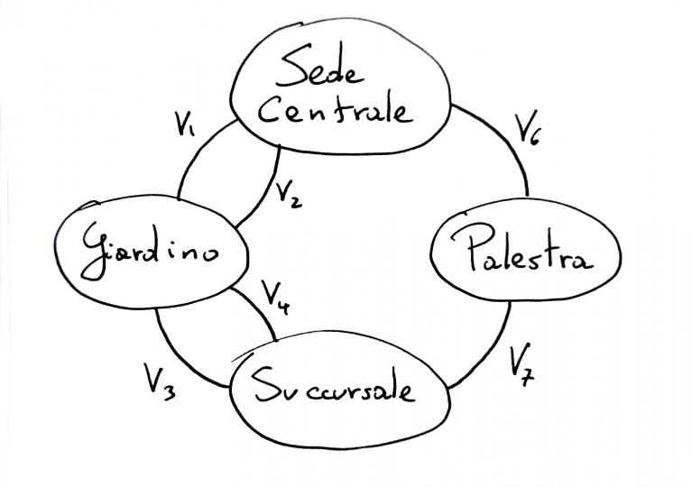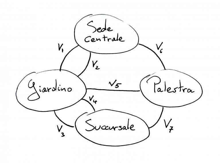 “Sì, ha perfettamente ragione, avendo tolto il varco v5 adesso sia il giardino che la palestra hanno un numero pari di varchi e in questo modo è possibile un cammino che passi per ogni varco una sola volta. Anzi, più di uno. Siccome però la sede principale e la succursale hanno ancora un numero dispari di varchi, la condizione è che si parta da uno di questi due edifici e si arrivi nell’altro.” “Bene, sono contenta di aver capito questo gioco dei grafi. Certo che è interessante, eliminando solo un arco cambia completamente l’essenza del grafo, si passa da uno dove una cosa è impossibile ad uno dove invece si può fare.” “Sì, in effetti questo è il bello e la ricchezza dei sistemi interconnessi che sono rappresentati dai grafi. Un piccolo cambiamento, magari in apparenza marginale, cambia completamente la struttura globale.” “Un po’ come le società fatte di persone, di sentimenti, di amore, di odio, di invidia e altruismo. Alle volte sono i piccoli cambiamenti, le insospettabili e minuscole modifiche che hanno ripercussioni enormi. Guerra o pace, ordine o caos.” “Sì, per questo la topologia dei grafi è un universo affascinante della matematica. Ma qual è la seconda cosa che le è venuta in mente?” “Ah, sì, giusto. Ho notato che sia nel primo grafo, quello da cui siamo partiti, sia nel secondo che le ho disegnato poco fa con un arco in meno, la somma di tutti i gradi dei nodi è sempre pari.