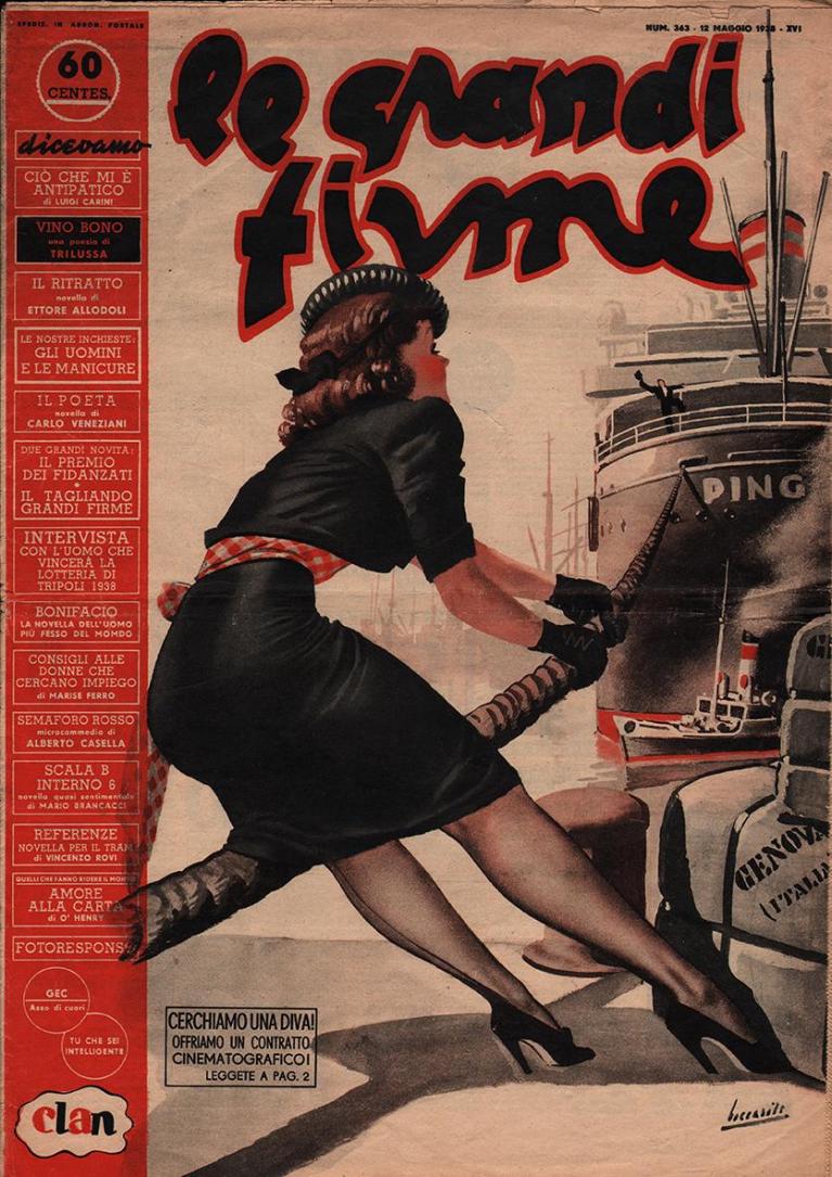 Gli anni Trenta sono il primo decennio “a colori” per la diffusione delle pellicole Kodachrome, subito utilizzate in campo editoriale e pubblicitario. ‘Le vie d’Italia’, il diffusissimo periodico del Touring Club, affida le proprie copertine in quadricromia a noti illustratori che fanno conoscere le bellezze del Belpaese, una scelta intermedia tra tradizione e innovazione. Nel corso del decennio emergono due illustratori di grande personalità come Giorgio Tabet e Walter Mollino che sono già figli del XX secolo e percorreranno una lunga carriera nei periodici italiani. Tema comune a tutti è la donna in copertina: si passa dalle donne provocanti degli anni Venti, alla madre di famiglia voluta dal fascismo, un’iconografia che però non aiuta a vendere copie, come dimostra a contrario ‘Grandi firme’, la rivista di racconti in concorrenza a ‘La Lettura’ del Corriere della Sera, ma che conosce una vera popolarità per le copertine ammiccanti di Gino Boccasile (come si celiava all’epoca: “Signorine grandi forme”).