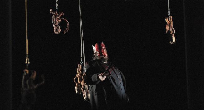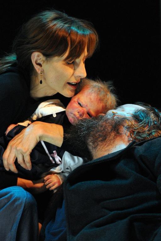 Perché c’è da dire che la cifra stilistica di questo spettacolo si risolve in una impostazione che ammicca al pop, passando dal pulp fino allo splatter: le streghe della profezia sono tre bambolotti parlanti (dal salotto di casa, non dai tuoni e lampi della brughiera), partorite – non è una novità – dal ventre stesso della Lady, in una scena in cui feti deformi e insanguinati vengono estratti dalle gambe della Regina (Frédérique Loliée); le loro pozioni sono composte da pezzi di pupazzi (il drago di plastica, il lupo di peluches, la biscia di gomma), gli arredi, man mano, si presentano sempre più piccini (le sedioline, le culle) e il tono dei dialoghi regredisce in uno sguaiato fanciullesco, carico di risatine e inciampi. “Se li avessi mostrati come sanguinari fin dall’inizio – dichiara il regista in un’intervista –, li avrei allontanati da noi”; ma se in alcuni momenti, soprattutto iniziali, il contrasto fra la truculenza dei contenuti e la leggerezza del linguaggio funziona, in certi altri passaggi, l’insistenza sulla dimensione ludica e bambinesca rischia di disinnescare la possanza del testo e delle azioni che si compiono. I personaggi sono tutti chiusi in se stessi, imprigionati in un’autarchia drammaturgica che ne spinge all’estremo i canoni consueti, sovraccaricandoli e trasformandoli, con verve espressionista, in cliché di loro stessi.