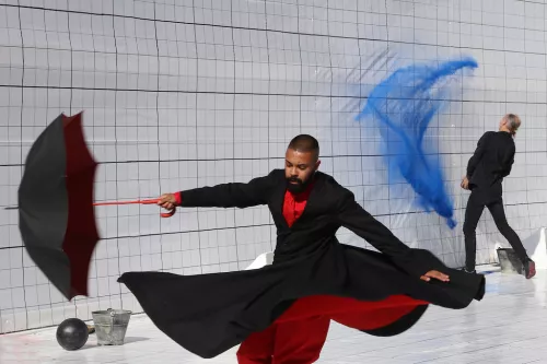 “L’inizio è nella sottrazione… essere ancora meno”. Uomini ingessati sul volto e sul busto nudo, con lunghe gonne. Rami secchi rossi nei parallelepipedi bianchi.