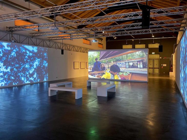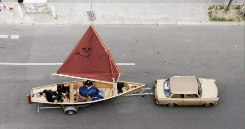 L’esposizione si intitola The wall between us, il muro tra noi. Ognuno dei tre termini è carico di senso. La famiglia Pellegrin vive a Berlino da anni, lì c’era un muro dal significato epocale sia per la sua erezione sia per la sua caduta, diventato il muro per antonomasia e il simbolo di ogni muro. L’idea surreale, in questo senso un po’ folle, che il duo ha concepito è stata quella di navigare nelle strade della città. Al centro dell’esposizione sta infatti una multiproiezione, su tutte e quattro le pareti della stanza, che mostra questo viaggio duplice, forse anche triplice. La famiglia sta su una piccola barca a vela trainata da un’automobile esattamente lungo il percorso che era quello del muro. Vi hanno passato un’intera giornata, alterandosi al timone, intrattenendosi, mangiando, giocando, leggendo, dormendo.