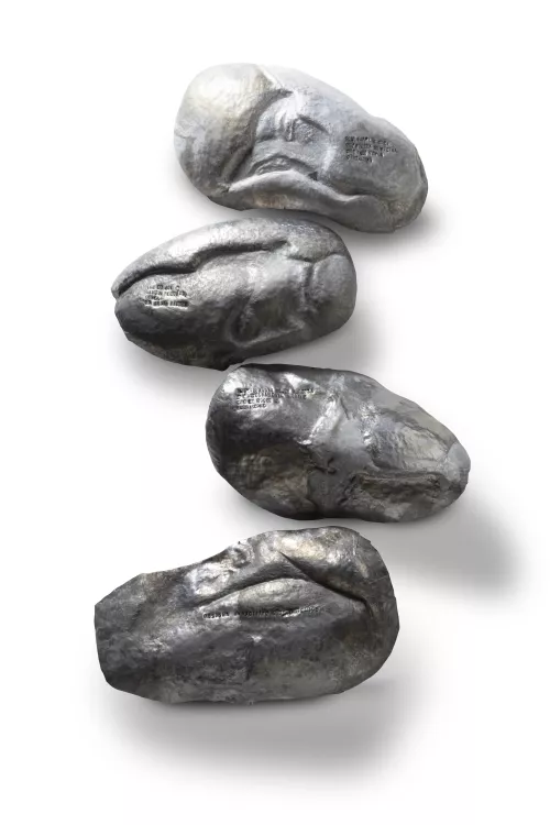 Le illustrazioni sono Pietre d''angolo di Valerio Gaeti, lamiera di alluminio battuto su pietre. Foto di Walter Gumiero.