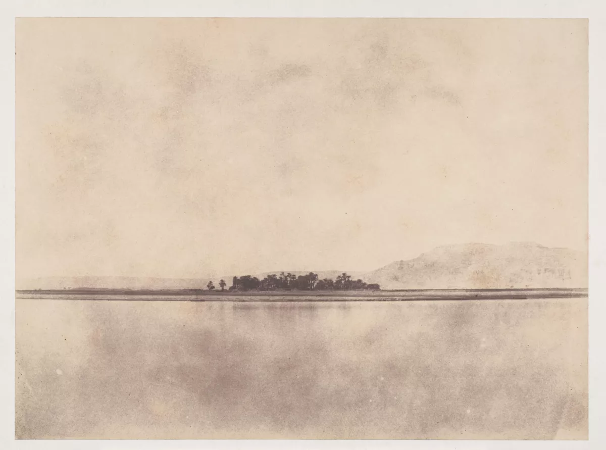 Sfugge a questo schema generale onnipresente nella fotografia degli albori una immagine scattata appena quindici anni dopo l’invenzione del nuovo medium: Il Nilo di fronte ai monti tebani è un cliché realizzato nel 1854 da John Beasley Greene.