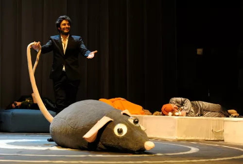 Il sipario si apre su un palcoscenico dove gli attori si presentano in tenuta da notte, ognuno con un peluche a rappresentarne la personalità. Sulla scena irrompe dall’alto un enorme topo-peluche dagli occhi giganti. Il palco è abitato da materassi colorati e da un televisore le cui immagini sono duplicate in un grande schermo da proiezione. Qui passeranno vecchi spezzoni televisivi, dalle signorine buonasera alla sigla dell’Eurovisione fino a stralci di telegiornali che ci riportano ai giorni nostri e alla sciagurata crisi della tanto vicina Grecia. Molto presto si delinea la struttura precisa (a volte forse troppo didascalica) che contraddistingue l’intero spettacolo, articolato in una sequenza di prove che i nostri protagonisti dovranno affrontare con l’escamotage (divertente) di quel modello oramai lontano nel tempo dei Giochi Senza Frontiere. Il fine è provare a creare una coesione di quell’Europa dilaniata oggi da silenziosi e rumorosi conflitti per dimostrare che ancora una certa vitalità del “contenitore Europa” è possibile. Ed è molto interessante il parallelismo che si crea tra il fine dello spettacolo, la creazione di una immaginaria coesione europea (o il perfezionamento dell’integrazione fin qui raggiunta, a seconda dei punti di vista), e l’unione che nasce tra i singoli attori che, allo stesso modo, debbono rendere forte e solido il loro “fare gruppo” per abitare insieme la scena.