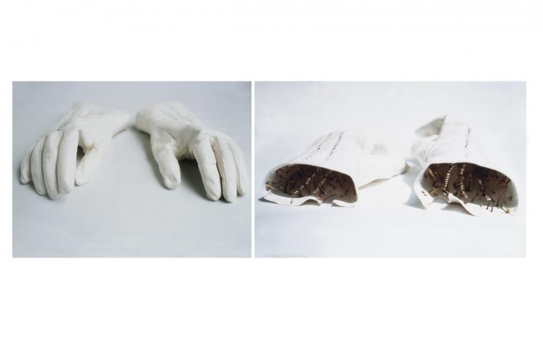 Marzia Migliora, Piacere, 2001 guanti in pelle bianca, spine, cm. 22x30 Edizione unica Courtesy dell’Artista e Galleria Lia Rumma, Milano/Napoli.