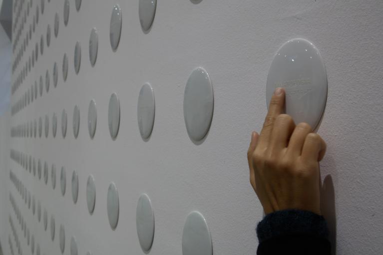 Tanatosi, 2006 seicento placche ovali di ceramica bianca 9X12 cm cadauna, con iscrizioni in alfabeto braille e caratteri latini, dimensioni totali dell’installazione 765x371 cm Courtesy dell’Artista e Galleria Lia Rumma, Milano/Napoli ph. Paolo Pellion.