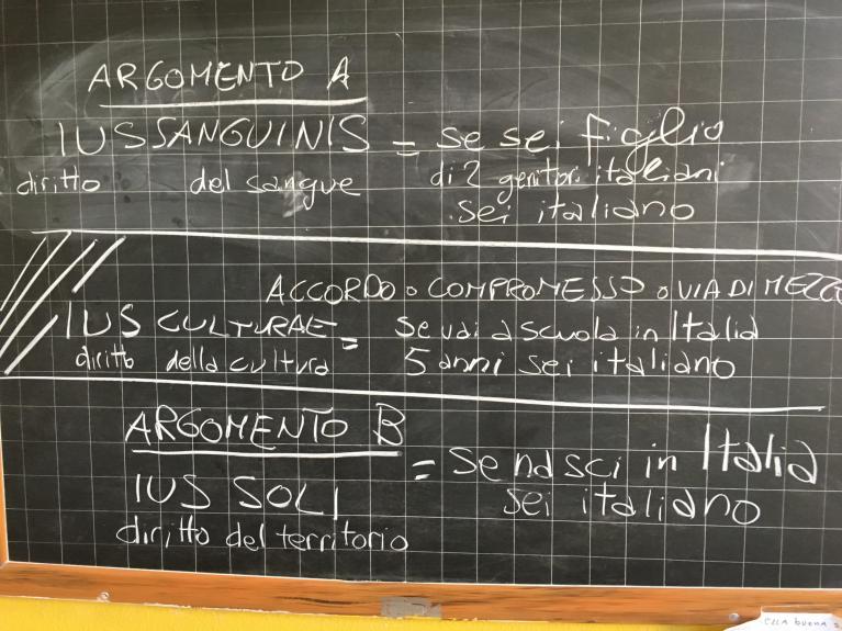 Perché hanno chiesto per Rami e Adam, come premio per aver salvato i compagni dal sequestratore, la concessione immediata della cittadinanza italiana? Perché Moise Kean, il calciatore della Juve ha dovuto aspettare i 18 anni per averla? «Sì, a lui l’hanno data subito perché è famoso! Conosco gente che la aspetta da 5 anni!» sbotta Widal. Già. Così piano piano il quadro si compone: mi accorgo che sono in mezzo a una unità di apprendimento. Obbiettivo? Conoscere e argomentare in uno scritto finale cosa distingue ius soli da ius sanguinis, capire che in Italia vige lo ius sanguinis, che a noi tutti a questo punto pare ingiusto, e in Germania vige uno ius soli addomesticato: dopo 8 anni che sei in Germania hai la cittadinanza anche se minorenne, se conosci la lingua e la cultura del Paese che ti ospita. Infine li accompagno alla situazione problema: come possiamo trovare un compromesso, un accordo tra ius soli e ius sanguinis?