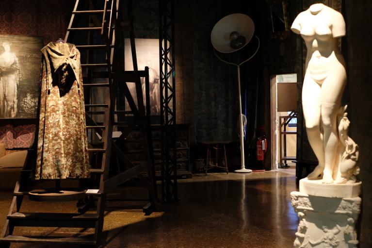 Cambiano i rumori anche al primo piano nobile del Palazzo, che diviene l’“Atelier Fortuny”, è il suono di passi ovattati da grandi tappeti: un luogo magico di 45 metri di lunghezza, con velluti alle pareti, quadri di Mariano e del padre, lampade e cupole di sua invenzione, arredi e opere d’arte tra cui accogliere e mostrare. Eleonora Duse, Peggy Guggenheim, Isadora Duncan, Sarah Bernhardt sono tra le più costanti indossatrici, nella vita e sul palco, degli abiti di Mariano. Marcel Proust nella Recherche lo cita tre volte, aprono negozi a Parigi, a Londra, a New York.
