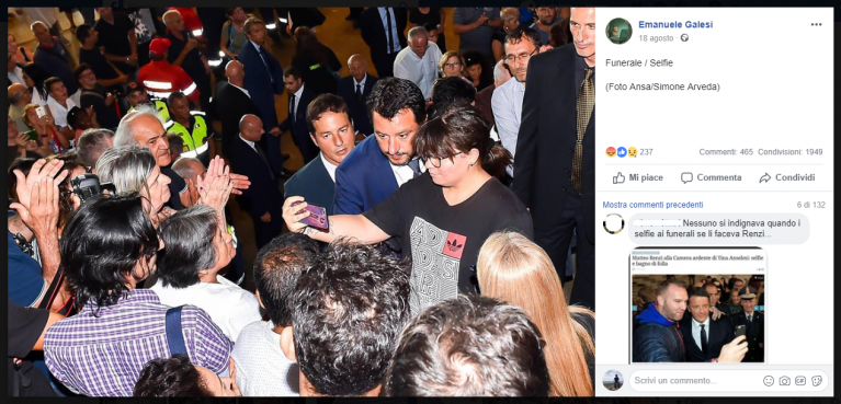 Il post su Facebook di Emanuele Galesi che riprende la foto Ansa del selfie di Matteo Salvini dopo i funerali di Genova (18 agosto 2018).