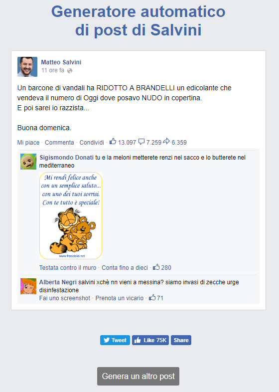 Posizionatosi come il politico portavoce dell’opinione pubblica, in un equilibrato sincretismo tra leader d’azione (i provvedimenti lampo), leader popolare (la retorica populista) e vedette (l’originaria componente antisistemica-antipolitica), in netto contrasto tanto con i politici “di mestiere”, quanto con i “tecnici-burocrati” di cui adesso si trova a essere successore diretto, Salvini è diventato il politico sempre sulla scena, quasi deprivato di un vero spazio “dietro le quinte”. Un politico appolipato sui propri account Twitter e Facebook, perennemente online, perché impegnato in una “campagna perenne”, forte di uno stile così riconoscibile, brevettato nei propri post, da poter essere parodicamente clonato da un generatore automatico. Il salvinese è un microgenere e un idioletto fatto di ruspe strillate, querele minacciate, caps lock INTENSIFICANTI, virgolette “ironiche” e appelli fàtici al proprio pubblico di ‘fratelli’ e ‘amici’ con domande da consumato social media manager: “Avete voglia di fare domande, di dare consigli, o semplicemente di stare insieme qualche minuto??”. Nel “Generatore automatico di post di Salvini” (la pagina Facebook relativa è stata creata il 2 dicembre 2014) ritroviamo tutto questo e di più: a ogni refresh della pagina, un semplice algoritmo associa in maniera random a una data struttura testuale un dato set di parole. Salvinianissimamente.