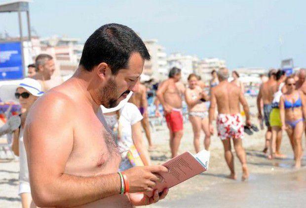 Salvini, libro in mano (nel verso giusto), in spiaggia al Papeete Beach di Milano Marittima (25 luglio 2015).