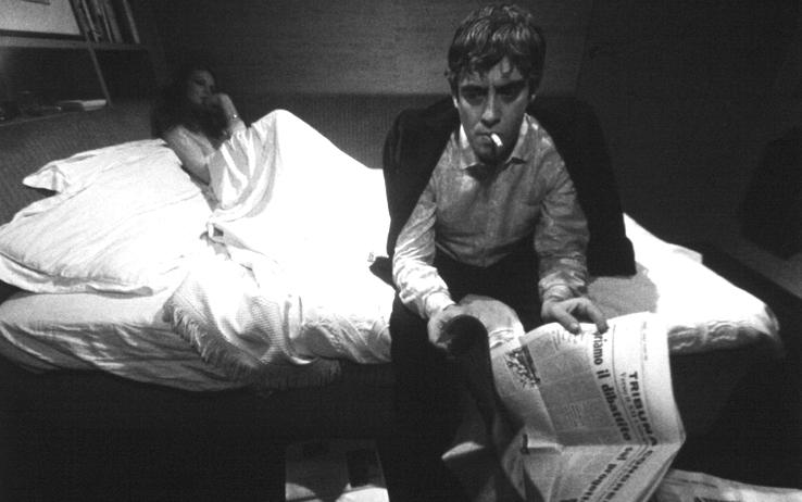 A proposito, l'avevo dimenticato, l'immagine della copertina, un fotogramma estrapolato da un film di Mario Schifano, Umano troppo umano… Una donna nuda sullo sfondo, in un letto ricoperto da lenzuola bianche, e un uomo in primo piano (Carmelo Bene), vestito, seduto sul ciglio del letto, che tiene in mano un giornale, una sigaretta in bocca, lo sguardo assorto. È un’allusione alla celebre frase di Lacan, “Non c'è rapporto sessuale”?