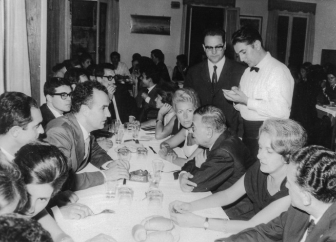 A cena con Sartre: si riconoscono a destra Jean-Paul Sartre e Rossana Rossanda; a sinistra Italo Calvino, Luigi Nono, Giuliano Scabia, Toni Negri