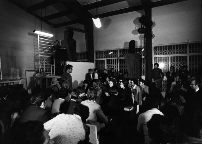 Azioni di decentramento a Torino: Giuliano Scabia interviene durante il dibattito in occasione di 600.000 al Centro sociale di Mirafiori sud, ph. Pier Giorgio Naretto (grazie a Stefano Casi per le foto di questa azione)
