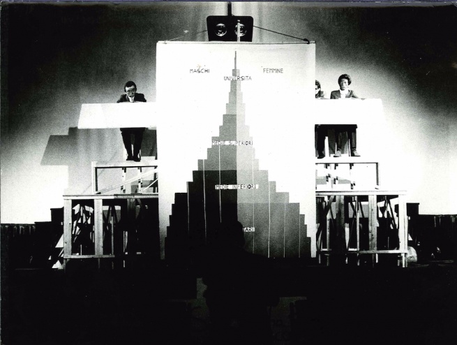 Azioni di decentramento a Torino: lo stendardo con la statistica sulla mortalità scolastica ripreso da Lettera a una professoressa, in Un nome così grande, ph. Italo Colombo