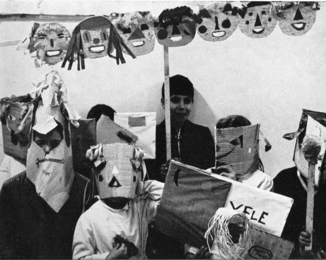 Azioni di decentramento a Torino: i bambini e il loro doppio; le maschere di cartone per il Teatrino di Corso Taranto, e – in alto – il grappolo delle sagome di teste in compensato, ph. Italo Colombo