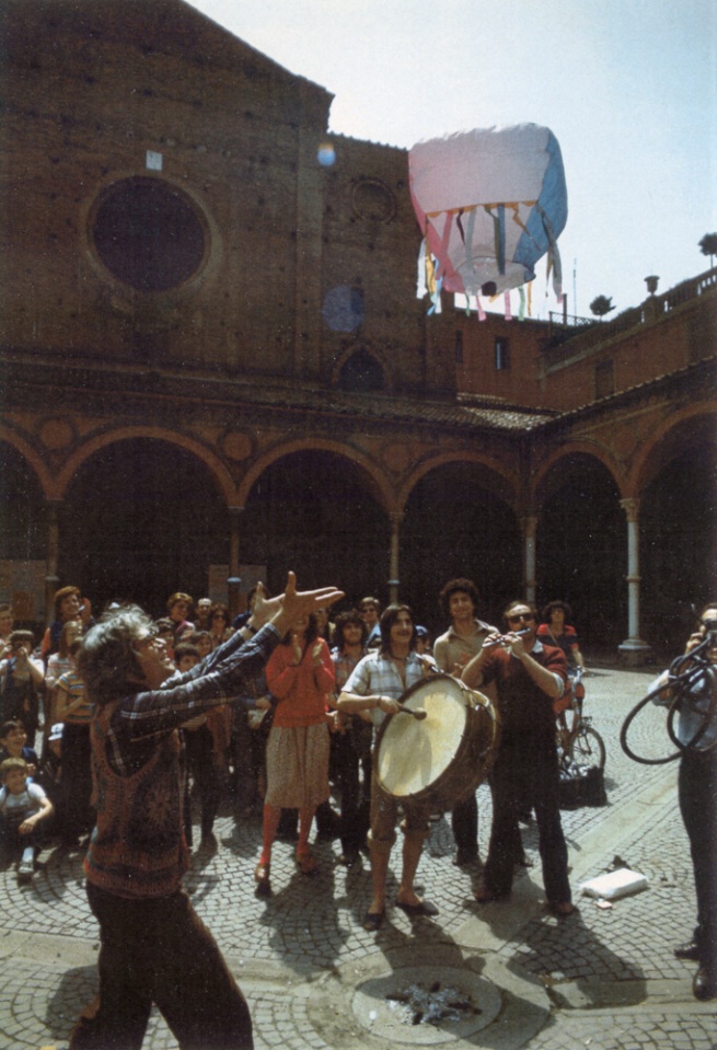 Lancio di mongolfiere nelle strade di Bologna dopo i fatti del marzo ’77, ph. Maurizio Conca