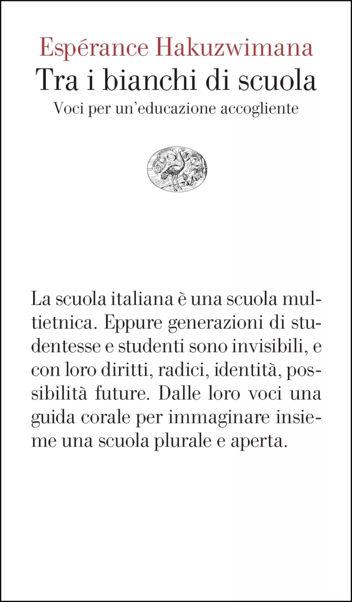 Espérance Hakuzwimana, classe 1991, bresciana e torinese, DNA rwandese, Università di Trento e poi Scuola Holden, ora al lavoro con la sua “Na.Co - Narrazioni Contaminate per mondi presenti” è al suo quarto libro, con questo Tra i bianchi di scuola. Voci per un’educazione accogliente (Einaudi 2024), dopo E poi basta. Manifesto di una donna nera italiana (People 2019), Tutta intera (Einaudi 2022) il suo romanzo d’esordio, e La banda del pianerottolo (Mondadori) romanzo young adult. La collana “Vele” Einaudi confeziona pamphlet di un centinaio di pagine e Hakuzwimana pamphletta bene; in esergo il libro Cuore e bell hooks, premesse lucide e ficcanti: «In questo testo non c’è la pretesa di dare risposte. Non si avanzano soluzioni facili. Ma mi piace immaginare che nella complessità di un vissuto stratificato, spesso pieno di limiti che fioriscono nel quotidiano, si possano scorgere brecce, stralci di positività. Speranze oserei dire. Per chi la scuola la frequenta da alunno e ogni anno, ogni giorno desidera essere visto semplicemente per quello che è: un essere umano in divenire, alla scoperta del mondo e di sé».