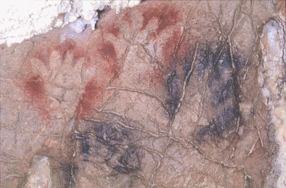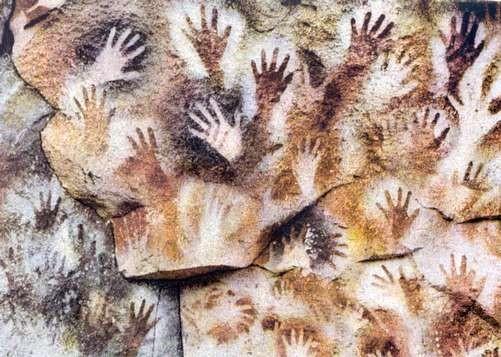 Ora, tenendo presente quest’immagine facciamo un salto di circa diecimila anni nel tempo e qualche migliaio di chilometri nello spazio. Siamo nell'attuale Patagonia, nella provincia argentina di Santa Cruz. Qui si trova una delle più antiche testimonianze della presenza umana nell'America australe, una caverna che ospita un gran numero di incisioni rupestri, la Cueva de las manos. L'esecuzione delle pitture è datata in un periodo di tempo tra i tredicimila e i novemilacinquecento anni fa e, tra immagini di caccia e raffigurazioni animali, si trova una parete di roccia ricoperta di contorni di mani umane eseguiti con varie tecniche. Alcuni segni sono prodotti in positivo intingendo il palmo nel pigmento e calcandolo sulla parete, altre distribuendo il colore attorno alla mano stessa. Alcune ricostruzioni ipotizzano che si sia utilizzata una tecnica grafica tipo stencil soffiando il colore dalla bocca e utilizzando la mano similmente a una maschera in modo da preservare dal pigmento la parte di roccia sottostante e ottenere il contorno della mano in negativo. I colori rossi sono ottenuti con l'ossido di ferro, i bianchi con il caolino e i neri con l'ossido di manganese.