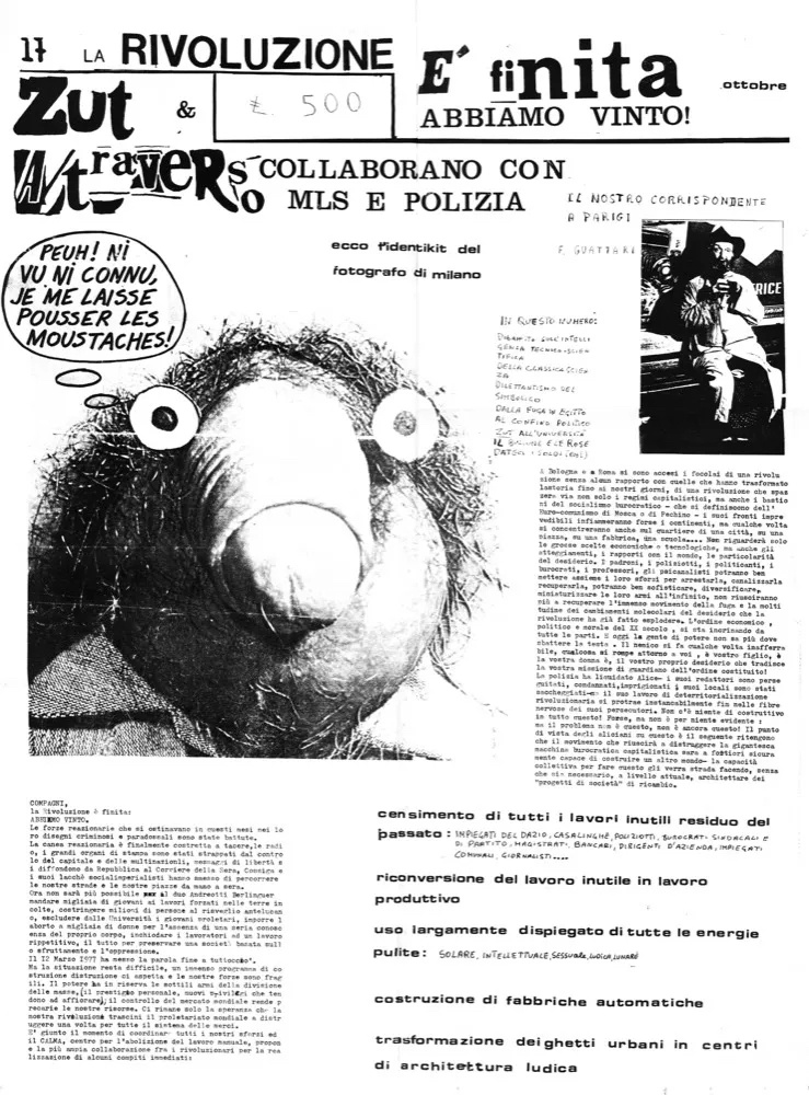 Questo studio, ricco di riferimenti a studi recenti, a teorie della scena a partecipazione, della performance ‘indisciplinare’, compie, in fondo, un’azione già nei suoi presupposti aporetica. Fa storia della performance, ferma atti viventi, pur interrogandosi sulla loro non riducibilità a reperti d’archivio (Peggy Phelan). Apre squarci su un pensiero divergente, sperimentatore di altre forme di socialità e di arte, costringendolo nei limiti di un ventennio, imposti dall’ipotesi scientifica della ricerca che lega trasformazione artistica a ribellioni e mutamenti sociali, con la convinzione che con la fine degli anni settanta si sia chiusa un’età di esperimenti propiziata da una stagione politica. Accenna, in realtà, a qualche opera che continua sulla strada della ricerca continua, oltre quei limiti cronologici, ma non sviluppa il discorso. Postula, a ragione, una trasformazione generale dello spirito di sperimentazione, testimoniata dall’ironico, disincantato e un po’ disperato titolo di un numero della rivista bolognese “A/traverso”, voce intellettuale e politica di Radio Alice, che nel 1978 gridava: “La rivoluzione è finita. Abbiamo vinto”.