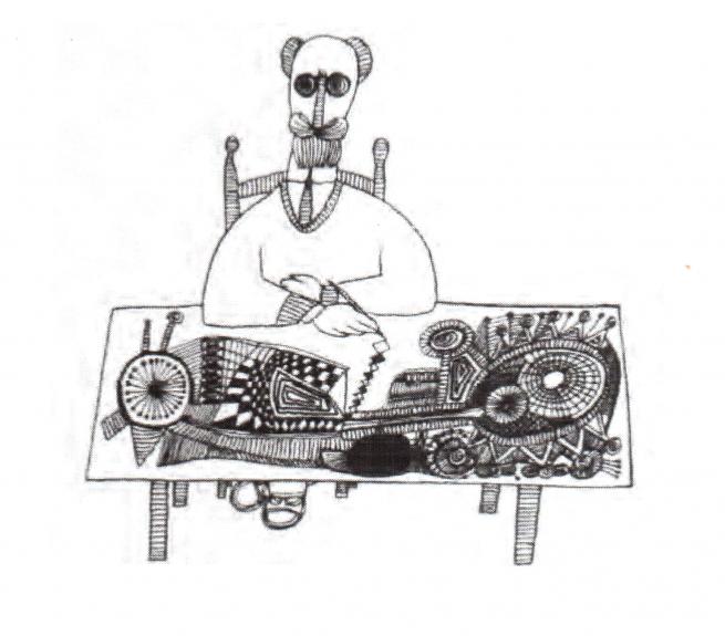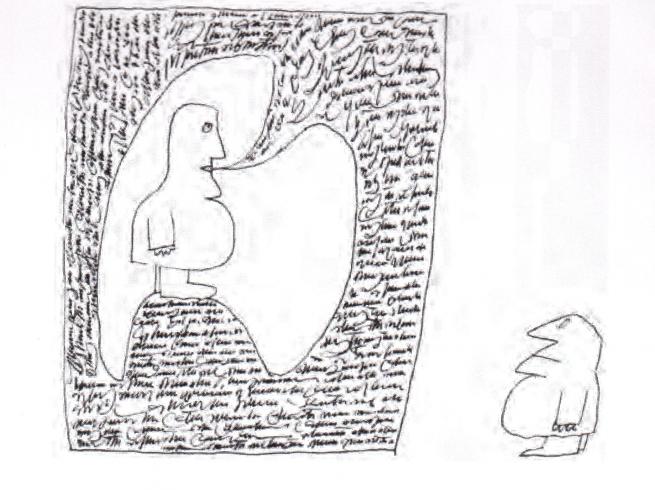 Moltissimi dei suoi disegni raffigurano l’abolizione imprevista, sconcertante, comica, della distanza che separa l’artista dal mondo: come il personaggio che, intento a disegnare un tavolo, ne diviene a sua insaputa una gamba. A rendere possibile questo scavalcamento è la virulenza, la natura proliferante della linea. L’uomo e le cose sono legati da un tratto comune, nel senso più stretto del termine; un tratto le cui forme danno vita a una scrittura.